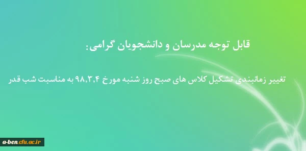 امتیاز دهید : تغییر زمانبندی تشکیل کلاس های صبح روز شنبه مورخ 98.3.4 به مناسبت شب قدر جمعه 3 خرداد 1398 ساعت 15:16