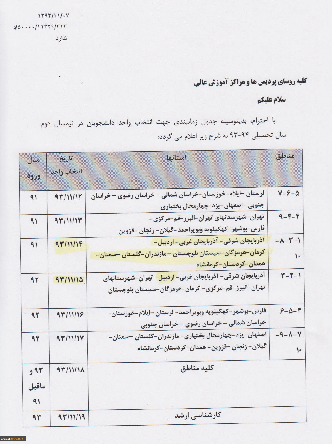 جدول زمانبندی انتخاب واحد کلیه ورودی ها